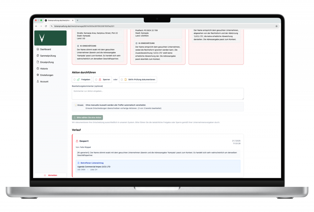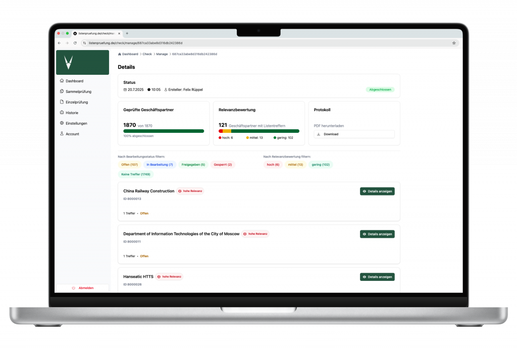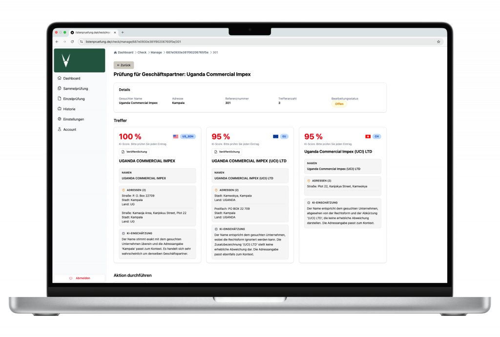 Mit Dominion laden Sie Ihre Excel-Liste mit den zu prüfenden Geschäftspartnern hoch. Die Daten werden sofort mit den relevanten Sanktionslisten abgeglichen, während unsere KI die potenziellen Treffer bewertet. Sie bewerten und dokumentieren die potenziellen Treffer und leiten bei Bedarf Maßnahmen ein. Bei erneuten Prüfungen erscheinen bearbeitete Treffer nur dann wieder als „unbearbeitet“, wenn sich der Listeneintrag tatsächlich geändert hat, etwa durch einen neuen Aliasnamen oder eine geänderte Adresse.
