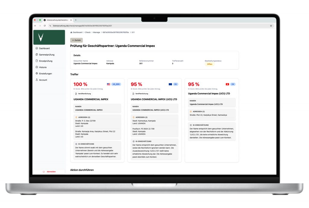 - Bewertung der Treffer: Falls es Übereinstimmungen gibt, müssen diese bewertet werden. Nicht jede Übereinstimmung bedeutet automatisch, dass ein Geschäft verboten ist. Häufig kommt es zu falsch-positiven Treffern, die aufgrund von Ähnlichkeiten im Namen auftreten. Diese müssen dann im Detail geprüft werden. Für Treffer auf der EU-Liste können Sie außerdem eine Prüfung durch das Bundesamt für Wirtschaft und Ausfuhrkontrolle (BAFA) beantragen.