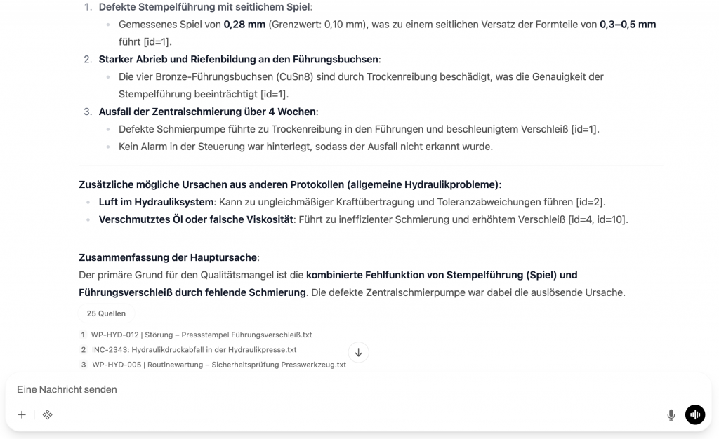 Beispiel: Ein Maschinenbauer nutzt lokale KI, um Wartungsprotokolle und Fehlerberichte der letzten 10 Jahre zu durchsuchen. Statt stundenlanger manueller Suche findet die KI in Sekunden ähnliche Fälle – inklusive Lösungsvorschlägen aus historischen Daten und der Betriebsanleitung der Maschine.